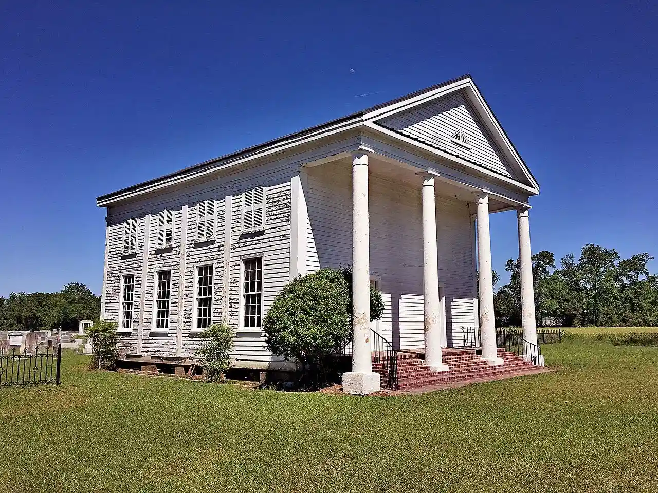 Lynchburg Presbyterian Church is a historic Presbyterian church located at South Lynchburg, Lee County, South Carolina. It was built in 1855, and is a two-story temple-form Greek Revival style building with an engaged tetrastyle portico featuring four massive stuccoed solid brick columns. The interior is primarily a single room with plaster walls and 21 foot high ceiling, undecorated except for a large circular plaster medallion in the center. Read more on Wikipedia