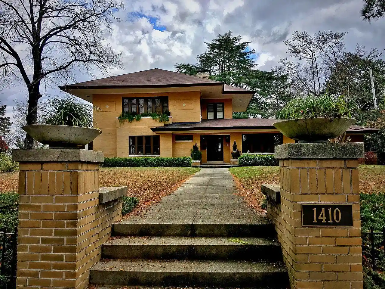 J. Davis Powell House is a historic home located at Columbia, South Carolina. It was built in 1919–1920, and is a two-story, irregular plan, yellow brick, Prairie Style dwelling believed to be designed by Floyd A. Dernier (1879-1934). It has a broad, low-pitched, hipped roof and sets of elongated, repeated windows on both floors. Also on the property are the contributing garage (c. 1920) with a second story addition (c. 1940); a pool house (c. 1920) and pool (c. 1935); four cast stone classical columns (c. 1920); a goldfish pond or pool (c. 1920); and an outdoor fireplace (c. 1922). Read more on Wikipedia