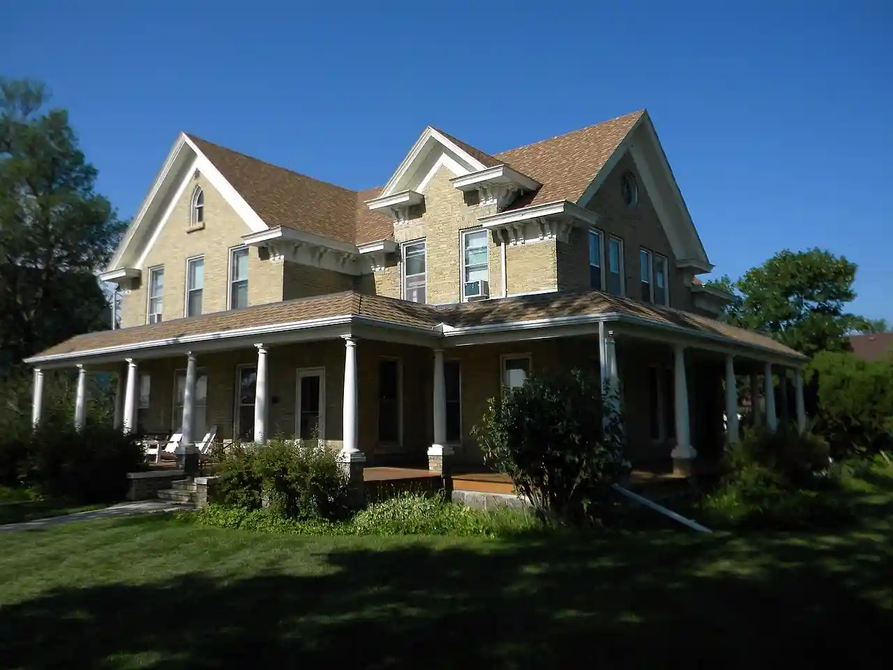 The Lars J. Fiksdal House is a historic house at 619 West 1st Street in Webster, South Dakota. It is an architecturally eclectic -story structure, faced in brick, which was built in several stages. The oldest portion of the house was built in 1881, and reached its present appearance by 1899. It exhibits elements of a wide variety of architectural style, with asymmetrical and irregular Queen Anne massing, a Colonial Revival wraparound porch, and Gothic Revival arched windows in some of its gable ends. The main roof cornice features heavy Italianate brackets. Many of the later alterations the house were made by Lars Fiksdal, a Norwegian immigrant. The house was converted into apartments in 1937, and is also known as the Fiksdal Apartment House. Read more on Wikipedia