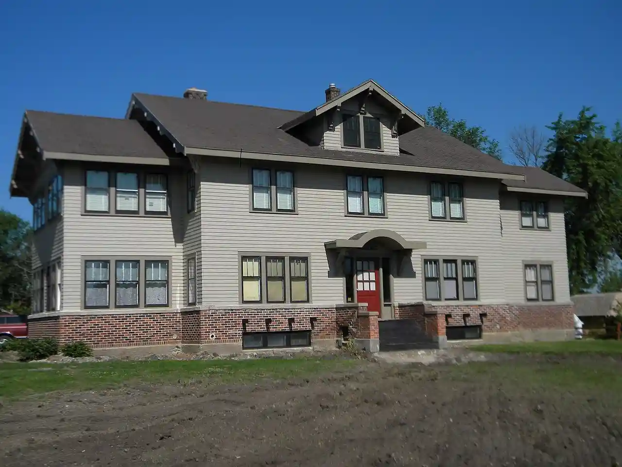 The Waddel Mansion is a historic house at 605 West 5th Street in Webster, South Dakota. Built in 1920 by William Waddel, a local lawyer, it was then, and still is, the largest house in the small community. The house has a symmetrical main block, with matching recessed wings on either side. The roof has Craftsman style deep eaves supported by large curving brackets, a detail repeated on dormers and projecting sections. The house was converted into apartments in the 1960s, but care was taken to preserve much of the interior woodwork. Read more on Wikipedia