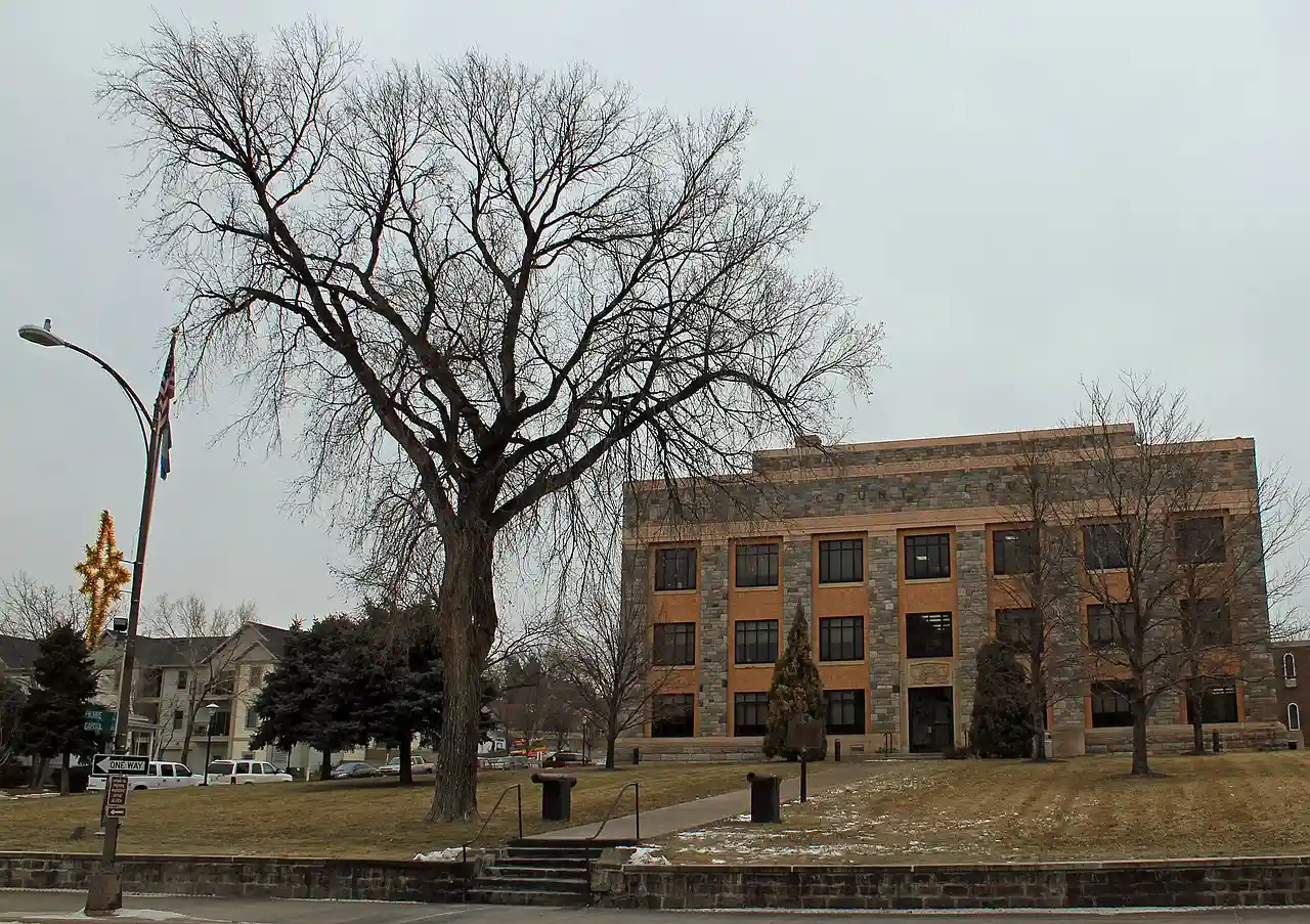 The Hughes County Courthouse, located on Capitol Avenue in Pierre, is the center of government of Hughes County, South Dakota. The courthouse was built from 1934 to 1935, replacing a building built in 1883. Architects Hugill & Blatherwick designed the building in the Moderne style with Art Deco details, a common design choice in courthouses of the period. While their design was generally minimalist, it includes some Art Deco decorations, such as spandrels with patterned brickwork that divide the vertically arranged windows. Read more on Wikipedia