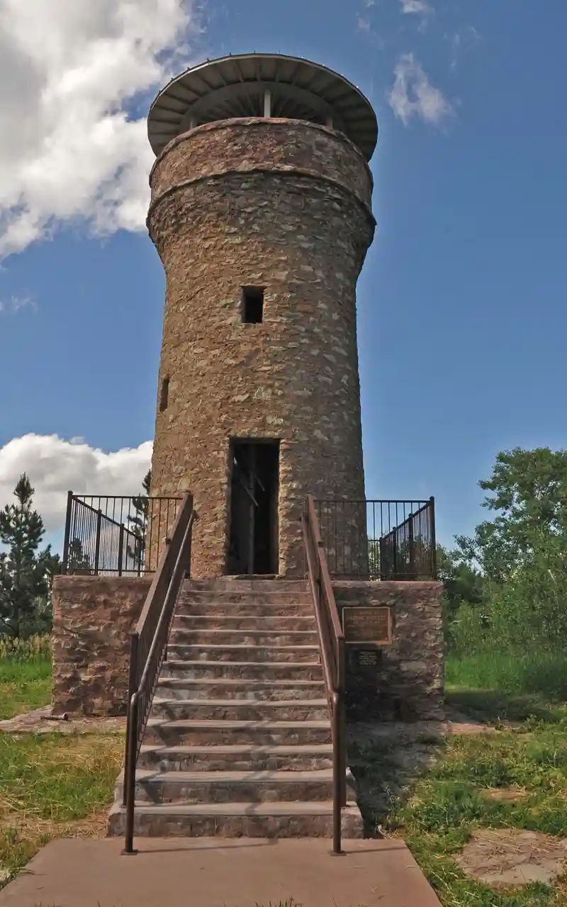 Mount Theodore Roosevelt Monument, also known as the Roosevelt Friendship Monument or Friendship Tower, located in the Black Hills National Forest on the outskirts of Deadwood, Lawrence County, South Dakota, is a 31-foot stone tower, including the six-foot-high platform, honoring Theodore Roosevelt. It was the first tribute to the president's memory and was dedicated July 4, 1919. Read more on Wikipedia