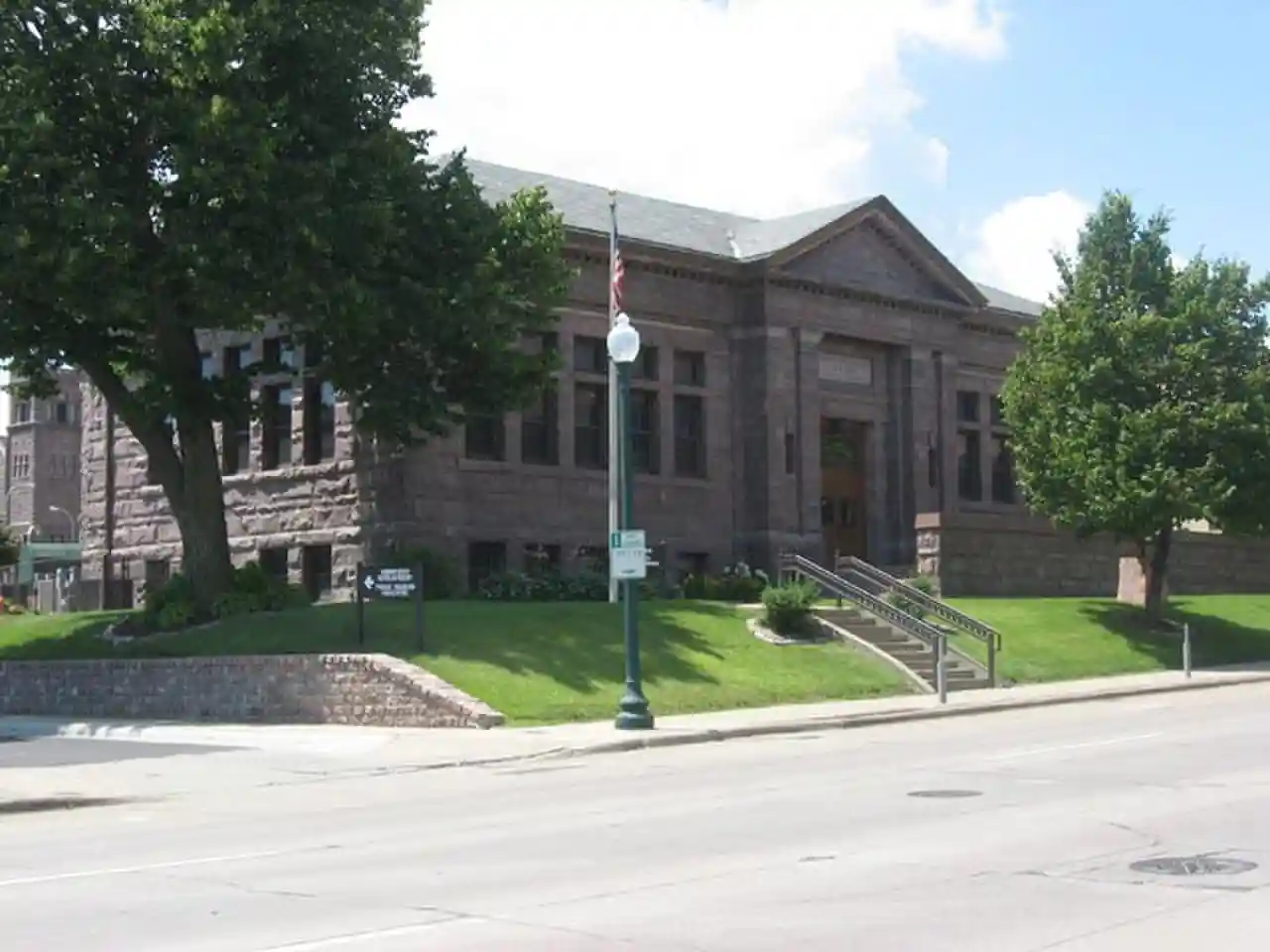 The Carnegie Free Public Library, also known as the Carnegie Town Hall, is a historic Carnegie library located at 235 W. 10th St. in Sioux Falls, South Dakota. The library was built in 1903 through a $25,000 grant from the Carnegie Foundation. Architect Joseph Schwartz designed the building, a Romanesque Revival structure with Neoclassical influences. The library was built from locally quarried quartzite, a popular local building material at the turn of the century. While the building's massive form and rough-hewn stone exterior are Romanesque, it features a Greek pediment above the entrance supported by four pilasters on either side of the doorway. The building represents the only use of Classical details in a quartzite building in Sioux Falls. Read more on Wikipedia