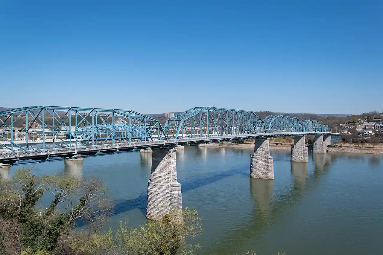 Built in 1890, the Walnut Street Bridge connects Chattanooga, Tennessee's downtown with North Chattanooga. The bridge's main spans are pin-connected Pennsylvania through truss spans. The top chord of these truss spans are configured in five sections, making the spans similar to the Camelback truss design. The bridge is historically significant as an extremely long and old example of its type; according to the Historic American Engineering Record: "The bridge was apparently the first non-military highway bridge across the Tennessee River." Read more on Wikipedia