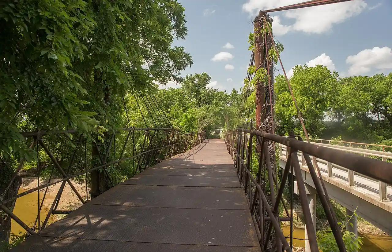 The Bluff Dale Bridge is a historic cable-stayed bridge (not a suspension bridge) located near Bluff Dale, Texas, United States. Built in 1891, the bridge spans across the Paluxy River. The road deck is above the river and held in place by fourteen cables attached to the towers made of iron pipe. Read more on Wikipedia