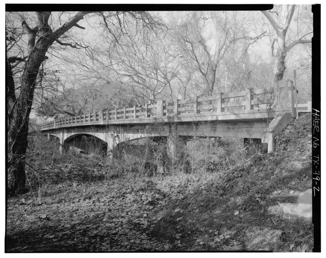 The East Navidad River Bridge, also known as the State Highway 3 Bridge at East Navidad River, is a historic concrete bridge that carries FM 1579 across the East Navidad River about east of Schulenberg in Fayette County, Texas. The cantilever bridge has a center span. Concrete piers and abutments support the two cantilever arms. The total width of the bridge is , providing an roadway. The bridge gives the appearance of an arch but is in fact two cantilevered arms joined in the center of the main span and anchored and countered at the ends. Concrete piers with skewed abutments provide support. Read more on Wikipedia