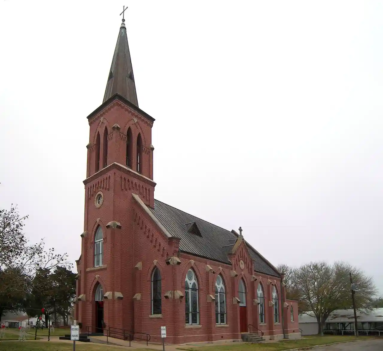 Nativity of Mary, Blessed Virgin Catholic Church is a historic church located at 2833 Farm to Market Road 2672 in High Hill, Texas. The church, which was built in 1906, was designed by prominent Texas church architect Leo M.J. Dielmann. Dielmann designed the red brick church in the Gothic Revival style. The interior of the church was painted by Ferdinand Stockert and Hermann Kern in 1912. The pair painted designs on canvas and affixed them to the church walls, resulting in decorations which resemble wallpaper. The designs were drawn freehand and include symbols such as angels, crosses with crowns, Stars of David, and bunches of grapes. Read more on Wikipedia