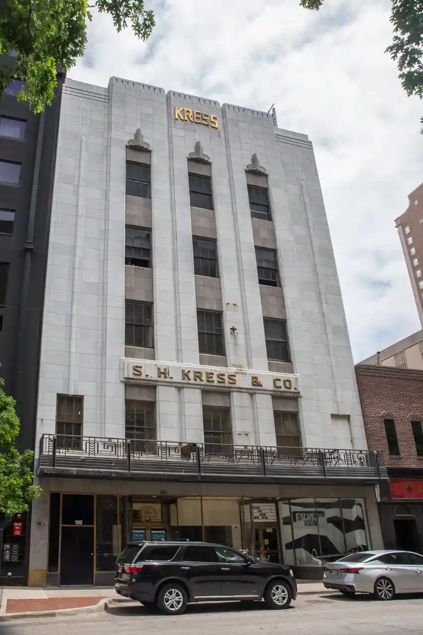 The Kress Building, also known as S.H. Kress and Co. Building, is a Classical Moderne Art Deco building in downtown Fort Worth. Designed by New York architect Edward F. Sibbert, the five-story Kress building served the “five-and-dime” chain from 1936 through 1960 and was one of the only major construction projects in Fort Worth built using private money during the Great Depression. It was listed on the National Register of Historic Places in 2007. In 2016, the building was converted into downtown housing. Read more on Wikipedia