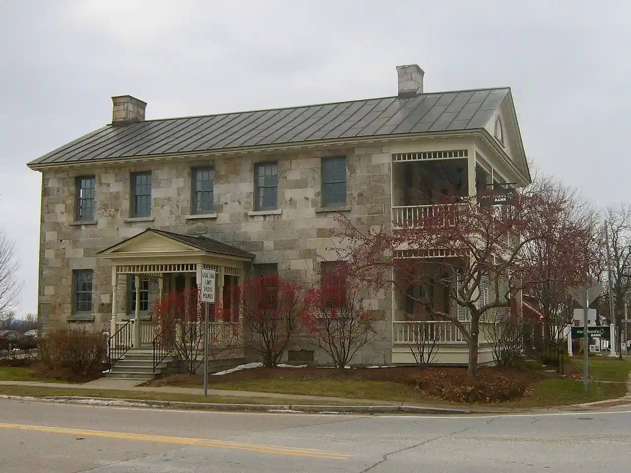 The South Hero Inn is a historic commercial building at 301 United States Route 2 (corner of South Street) in the center of South Hero, Vermont. Built in 1829, it is a prominent local example of a stone building with Federal and Greek Revival features, and served as a traveler accommodation until the early 1970s. It was listed on the National Register of Historic Places in 1975. It now houses a bank. Read more on Wikipedia