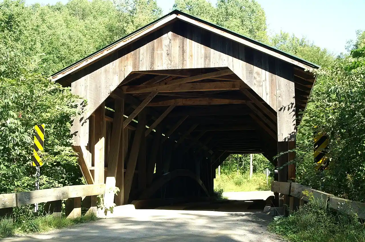 The Grist Mill Covered Bridge, also known as the Scott Covered Bridge, the Bryant Covered Bridge, and the Canyon Covered Bridge, is a covered bridge that carries Canyon Road across the Brewster River, off Vermont Route 108 in Cambridge, Vermont. Built in the 19th century, it is one of a small number of surviving Burr arch truss bridges in the state, and is one of three left in Cambridge. It was listed on the National Register of Historic Places in 1974. Read more on Wikipedia