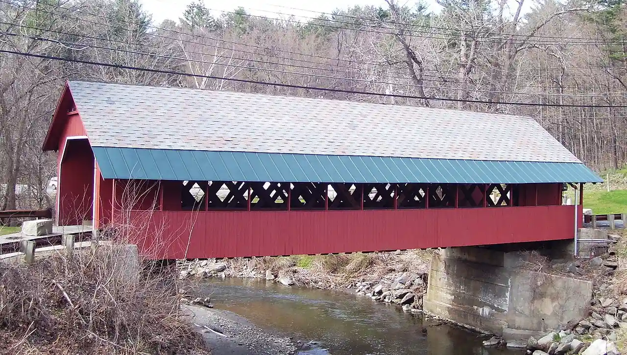 The Creamery Covered Bridge is a historic covered bridge in West Brattleboro, Vermont. Now closed to traffic, the Town lattice truss bridge formerly carried Guilford Road across Whetstone Brook, just south of Vermont Route 9. Built in 1879, it is Brattleboro's last surviving 19th-century covered bridge. Read more on Wikipedia