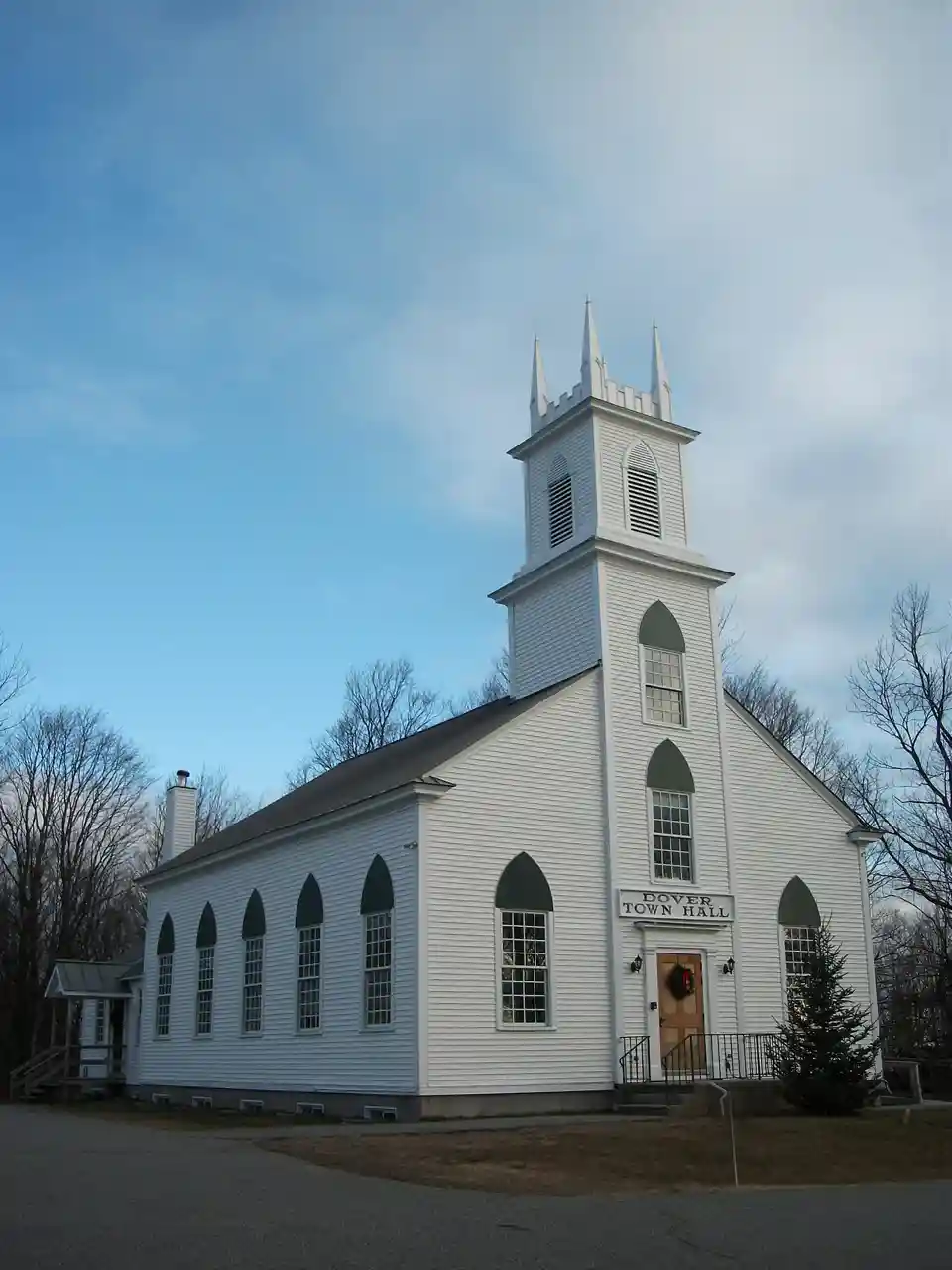 Dover Town Hall is located in the village center of Dover, Vermont, at the junction of Holland and Taft Brook Roads. Built in 1828, it is a well-preserved example of a transitional Federal-Gothic Revival church building, converted to government use in 1875. It was listed on the National Register of Historic Places in 1988. Read more on Wikipedia