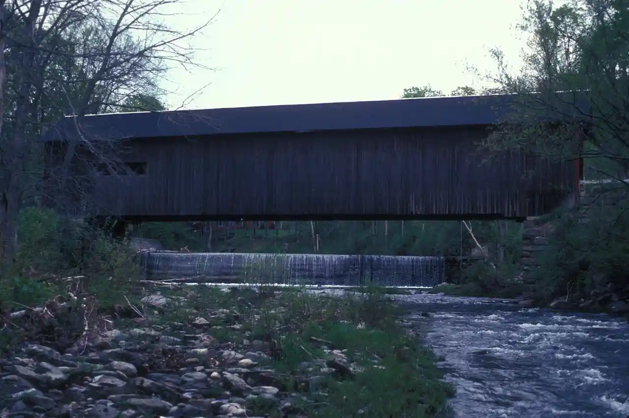 The Green River Covered Bridge is a covered bridge in western Guilford, Vermont. Built in the 1870s by Marcus Worden, it is a Town lattice truss bridge, carrying Green River Road over the eponymous river in a small rural village of the same name. It was listed on the National Register of Historic Places in 1973. Read more on Wikipedia
