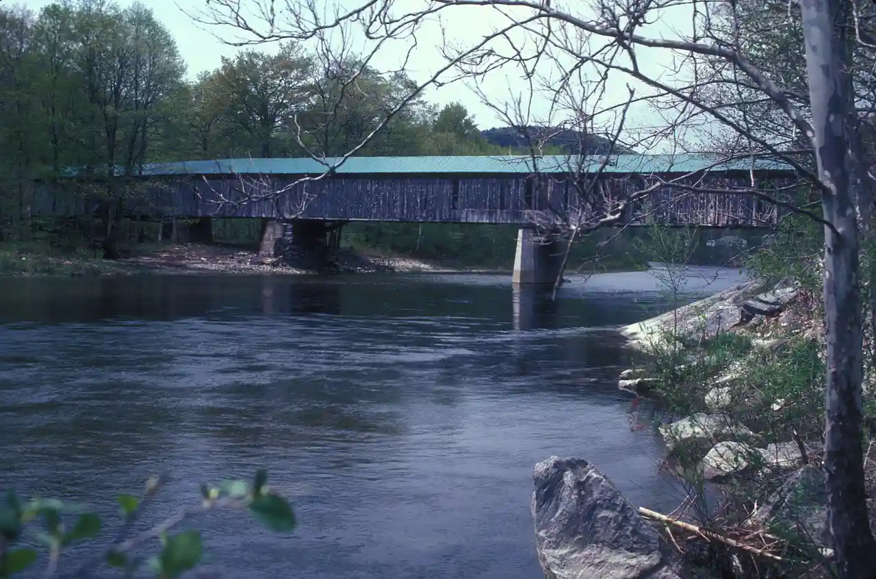 Scott Covered Bridge is a covered bridge spanning the West River in Townshend, Vermont. Built in 1870, it is at one of the longest covered bridges in the state (the West Dummerston Covered Bridge is longer), exhibiting three different forms of support: a Town lattice truss, kingpost trusses, and laminated arches. The bridge was listed on the National Register of Historic Places in 1973. It is closed to all traffic. Read more on Wikipedia