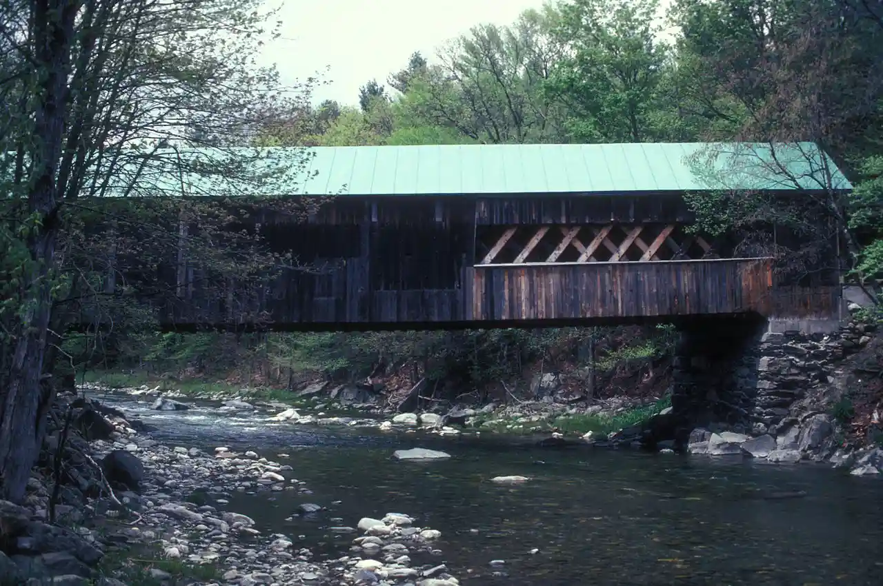 The Williamsville Covered Bridge is a historic covered bridge, carrying Dover Road over the Rock River in Newfane, Vermont. Probably built in the 1870s, this Town lattice truss bridge is probably the oldest covered bridge in Windham County, and is the only one surviving in the town of Newfane. It was listed on the National Register of Historic Places in 1973. Read more on Wikipedia