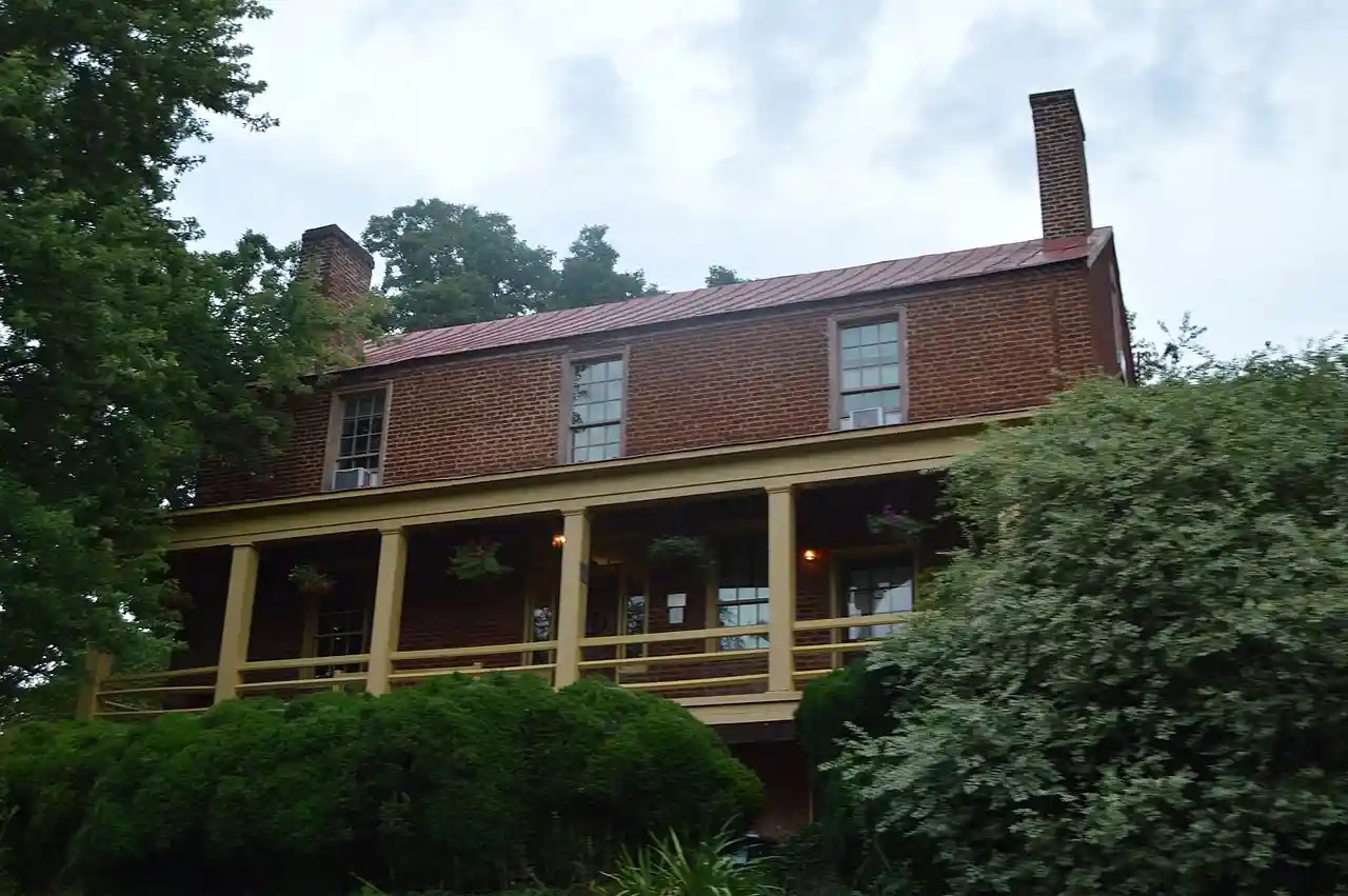 Crossroads Tavern, also known as Crossroads Inn, is a historic inn and tavern located at North Garden, Albemarle County, Virginia. It was built about 1820. In the mid nineteenth century, Clifton G. Sutherland, son of Joseph Sutherland, owned and ran the tavern which was located on the Staunton and James River Turnpike. It served as a tavern and overnight lodging for farmers and travelers using the turnpike. In 1889, Daniel B. Landes bought the land at the public auction of the estate of Clifton Sutherland.Albemarle County Deed Book 102, p. 366:1889 The property continued to be conveyed to various owners over the years. The Crossroads Tavern is an early nineteenth century two- to three-story, three-bay, double pile brick structure. The building sits on top of a brick and stone foundation, is roofed with tin and has pairs of interior brick chimneys on either gable end. The brick is laid in five course American bond with Flemish variant.Lay, K. Edward (2000), "Architecture of Jefferson Country", p. 170, University Press of Virginia; Windows on the basement level at the rear of the house (north side) are barred; other basement windows are nine-over-six sash. Put-holes are found at the west end of the building, formerly providing sockets for scaffold boards should repairs be necessary.Staunton and James River Turnpike survey, DHL no. 02 under the direction of K. Edward Lay, Assistant Dean of Architecture, University of Virginia, 1980, page 1 The front facade is dominated by a porch on the second story extending the entire width of the south and east facades. It is supported by five rounded brick columns and the tin roof above is supported by simple square wooden pillars connected by horizontal rails. Doors of the front of the basement level open respectively into kitchen and dining room and into a spirits cellar with its original barrel racks as well as a laundry fireplace. Floors on this level were originally dirt but dining room and kitchen floors have been cemented. The main entrance door on the second level, with its multi-panes lights, opens onto a central stair hall with two main rooms on either side. This stair hall has an ascending stair at its front and both ascending and descending stairs toward its center. Formerly the ascending stairs led to upstairs areas which did not connect. There is no ridge pole in the three attic rooms. The interiors of windows and doors on the main entrance side have extremely long wooden lintels. With few exceptions, the interior woodwork is original, including floors, chair rails, mantels and built in cupboards. Also on the property is a two-story contributing summer kitchen, brick up to the second story and frame above, and with an exterior brick chimney at the rear gable with fireplaces on both floors.Staunton and James River Turnpike survey, DHL no. 02 under the direction of K. Edward Lay, Assistant Dean of Architecture, University of Virginia, 1980, page 2 It is operated as a bed and breakfast. and Accompanying two photos Read more on Wikipedia