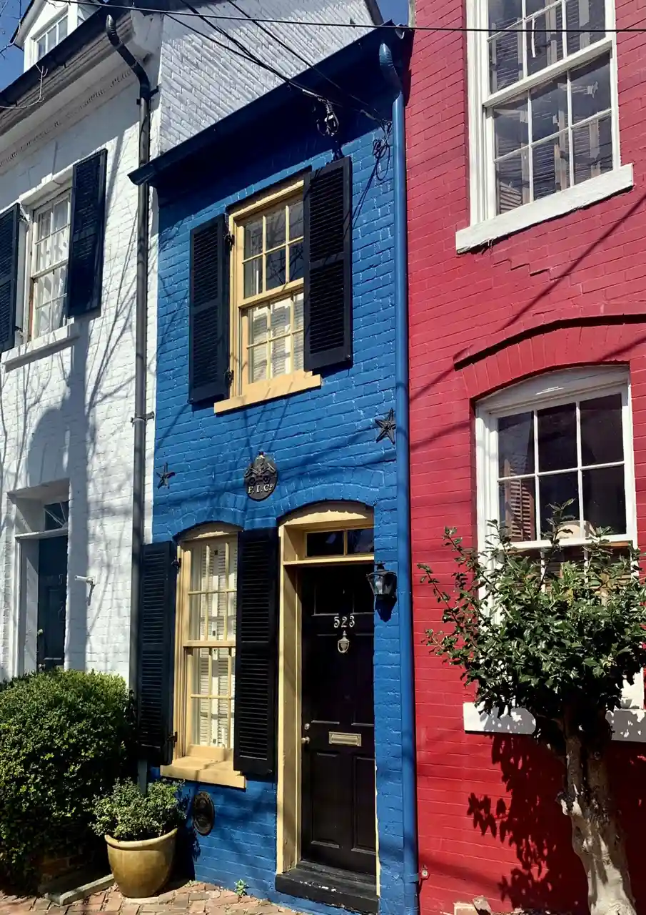 The Hollensbury Spite House is a spite house located at 523 Queen Street in Alexandria, Virginia. The narrow building measures 7-feet 6-inches (2.3 m) wide and is often called the skinniest house in the United States. The house has drawn international attention, being covered by numerous news outlets, and was once featured on The Oprah Winfrey Show. It is frequently visited by tourists who often pose in front of the building and is also included on local history tours. The house is 350 square-feet (32.5 sq m) but also includes an outdoor patio and garden, providing additional entertaining space. Because of its narrow front door and small interior space, the house is decorated with smaller furniture pieces and antiques. Read more on Wikipedia