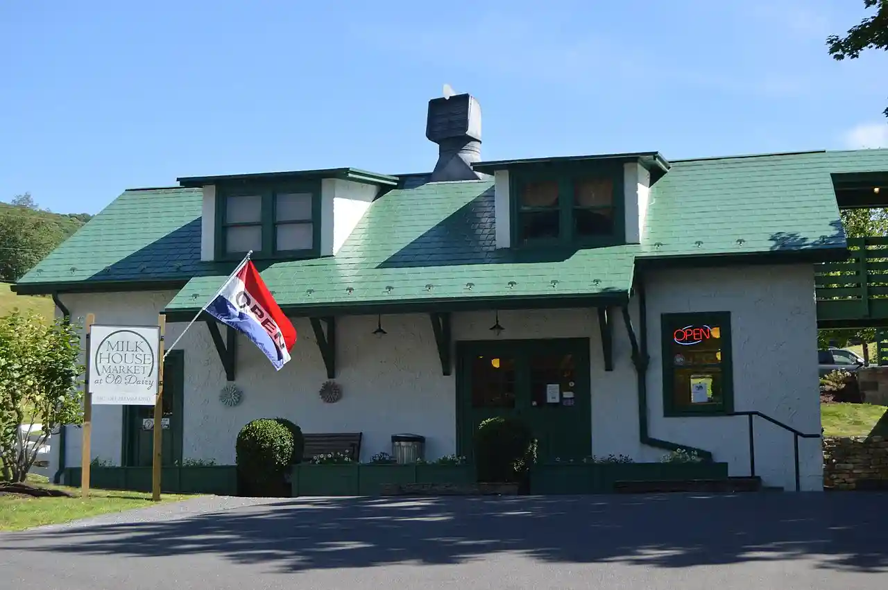 Homestead Dairy Barns, also known as Miller Mill and Inn at Gristmill Square, is a historic dairy barn complex and national historic district located at Warm Springs, Bath County, Virginia, USA. The district encompasses seven contributing buildings. The complex consists of the Main Barn with its attached tile double silos, a Bottling Building, Milking Barn, Calving Barn, Ham House, Herdsman's Cottage, and Bull Barn. The complex was built by the Virginia Hot Springs Company in 1928 to support the operations of the nearby Homestead resort. They are frame buildings, many of which are clad in stucco and painted white with unifying green trim. They include repetition of Colonial Revival and Craftsman details throughout. and Accompanying four photos and Accompanying map Read more on Wikipedia