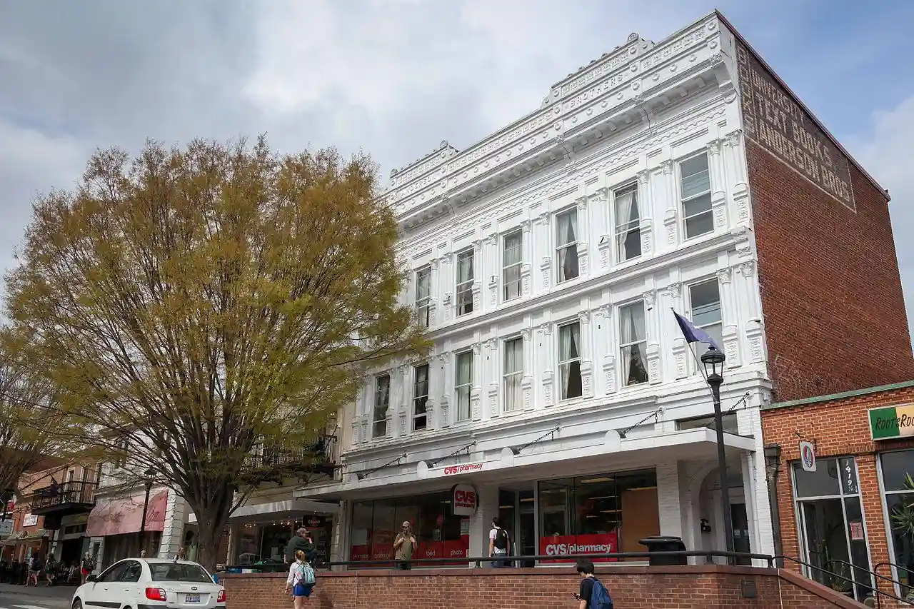 Anderson Brothers Building, also known as Anderson Brothers Book Store, is a historic commercial building located at Charlottesville, Virginia. The original section was built in 1848, and expanded to its present size in 1890–1891. It is a three-story, seven bay Late Victorian style building. It is constructed of brick and has a metal clad facade. and Accompanying photo Read more on Wikipedia