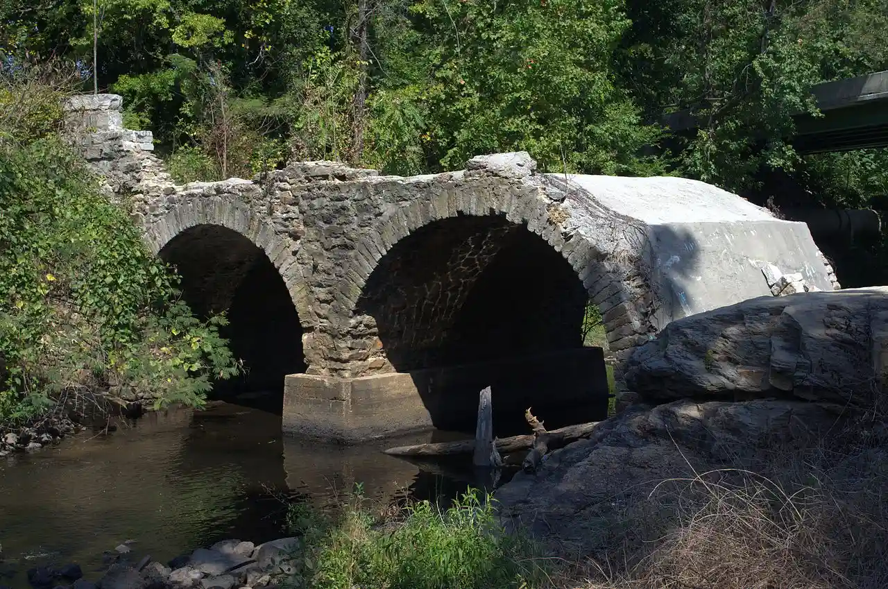 The Bridge at Falling Creek is a historic stone arch bridge located near Richmond, in Chesterfield County, Virginia. It was built about 1823 of rough-cut, uncoursed granite. It is carried by two semicircular barrel arches with voussoirs of rough-finished granite. Its width including parapets is , and its length is . It carried the southbound lanes of U.S. Route 301 until 1977, when it was put out of service. It is accessible from a wayside that includes the Falling Creek UDC Jefferson Davis Highway Marker. and Accompanying two photos The bridge was partially damaged in 2004 but still remains significant. It was listed on the National Register of Historic Places in 1995. Read more on Wikipedia