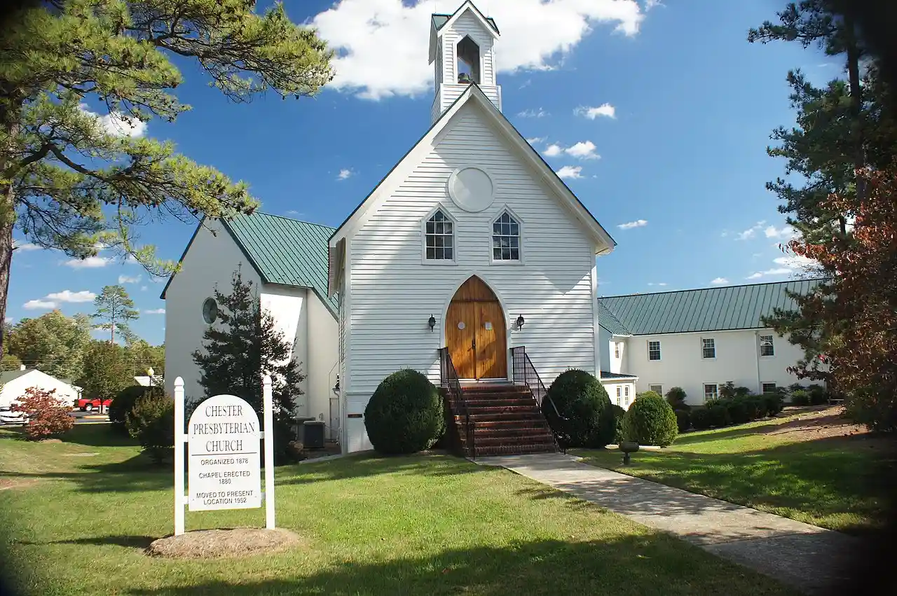Wyatt Chapel at Chester Presbyterian Church is a historic Presbyterian church located at the junction of Osborne Road and VA 10 in Chester, Chesterfield County, Virginia. The chapel is a wood-frame structure measuring 20 by 30 feet and is covered by a steeply pitched gable roof with relatively deep, unornamented eaves. It is an elementary expression of American Gothic Revival architecture. Read more on Wikipedia