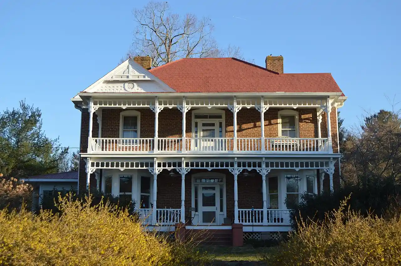 Oakdale is a historic home and farm located near the town of Floyd in Floyd County, Virginia, United States. The house was built about 1890, and is a large two-story, three-bay, frame dwelling in the Queen Anne style. It has a complex hipped roof and features a double-tier heavily ornamented front porch with turned posts, a spindle frieze, and sawn brackets. Also, on the property are a contributing large center-aisle barn (c. 1890), a two-story brick general store building (c. 1890), and a granary (c. 1915) and garage (c. 1935). and Accompanying five photos Read more on Wikipedia