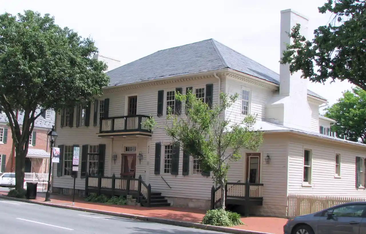 The Chimneys is a historic house located in Fredericksburg, Virginia. The house was constructed around 1771–1773. The house is named because of the stone chimneys at each end. The Georgian home was added to the National Register of Historic Places in April 1975. Of note are the interior decorative woodwork in the moldings, millwork, paneling indicative of building styles of the period. The decorative carving on the mantelpiece as well as on the door and window frames is particularly significant. Read more on Wikipedia