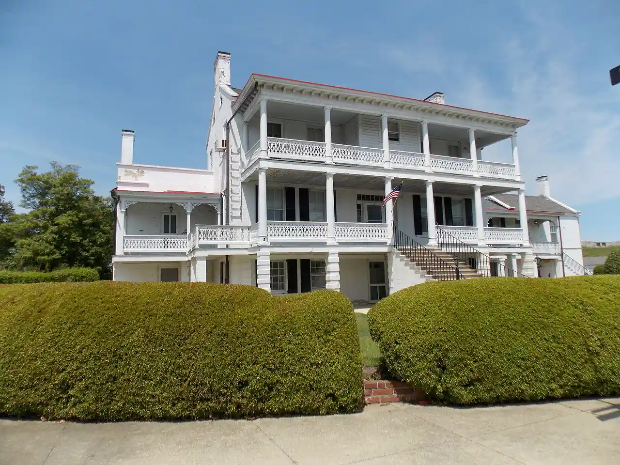 Quarters 1, also known as Building 1, is a historic officer's quarters located at Fort Monroe, Hampton, Virginia. The original section was built in 1819, and consists of a three-story, central block, double pile residence with flanking, two-story wings in the Federal style. The northern wing, containing a large kitchen and cistern below, was erected as a separate building in 1823 and later connected to the main building in 1871. The 1871 connecting structure includes an octagonal solarium. The front facade features two-story porches, with carpenter Gothic railings, that were added during the last quarter of the 19th century. The interior features an elliptical staircase and an elliptical dome. and Accompanying four photos Read more on Wikipedia