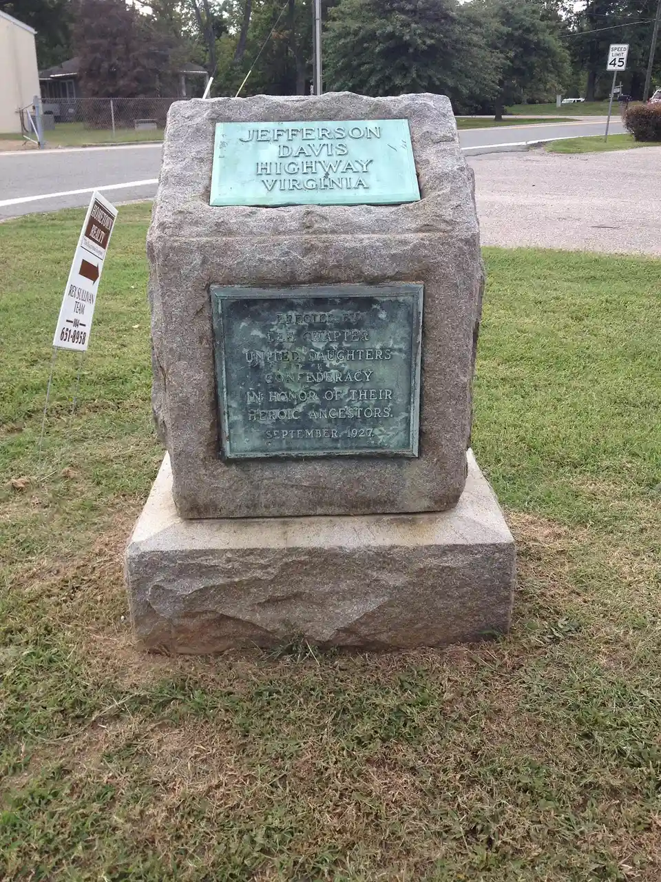 The Jefferson Davis Highway Marker is a commemorative marker on the Jefferson Davis Highway, in Hanover County, Virginia, near Ashland. It is a gray granite stone, with a slanted top, with two bronze plaques. The Jefferson Davis Highway was conceived and marked by the United Daughters of the Confederacy, as a counter to the Lincoln Highway in the north, during 1913–1925. In that era, named highways were being marked as automobile travel increased, and the advent of numbered highways eventually loomed. The marker was placed at the junction of what is now US Route 1 and Cedar Lane (Virginia Route 623), between Richmond and Ashland, in 1927. It has been moved twice: in the 1970s it was moved to accommodate the widening of Route 1, and it was moved across Route 1 in the 1980s. Read more on Wikipedia