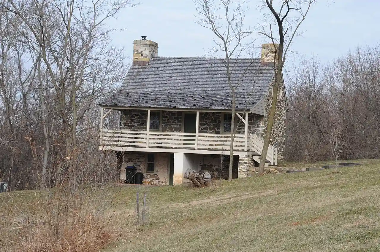 The Amos Goodin House is a historic house at 37738 Wright Farm Road, in rural Loudoun County, Virginia northeast of Purcellville. Once the center of a larger landholding, the house is a two-story stone farmhouse built about 1810, with a wooden porch extending across the front. The layout of the house is a rare surviving example of an English "Mora Stuga" plan, with a hall that has a winding stair, and a single large chamber occupying most of the ground floor. Read more on Wikipedia