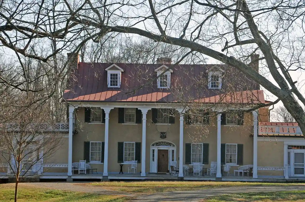 Welbourne is the main house of what was formerly a large plantation in Loudoun County, Virginia. The original core of the house, in what is now the south wing, was built about 1770. The stone house was two and a half stories tall, with three bays, one room deep. Some of the original woodwork survives in this section of the house. The house was expanded greatly by John Peyton Dulany around 1830, adding five bays in stuccoed brick, connected to the original house by a transverse hall. The interior of the new section features Greek Revival detailing. A two-story portico with Italianate columns was added in the 1850s, and the house was further enlarged with a two-story addition on the south side in the 1870s. The whole is covered with stucco, detailed with faux-painted joints. Read more on Wikipedia