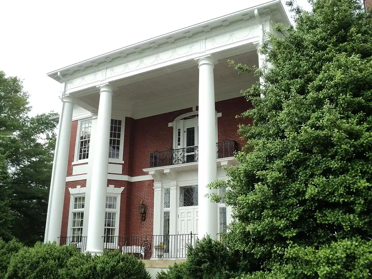 Scuffle Hill is a historic home located at Martinsville, Virginia. It was built between 1917 and 1920, and it occupies the shell of an earlier house, built in 1905, which was gutted by fire in 1917. It is a two-story, brick mansion with a gable roof with dormers, two-story polygonal window bays, a poured concrete foundation, and granite belt courses. The front facade features a Doric order portico in the Colonial Revival style. The original house was built by tobacco magnate Col. Pannill Rucker and rebuilt and later owned by the Rives Brown family, and subsequently by the Pannill family, owner of Pannill Knitting. The home later became the parish house of Christ Episcopal Church. The home is named for the first plantation in Henry County, Virginia of Revolutionary War hero General Joseph Martin, who called his first acreage "Scuffle Hill," as he said he had to scuffle to come up with the money for it. and Accompanying two photos Read more on Wikipedia