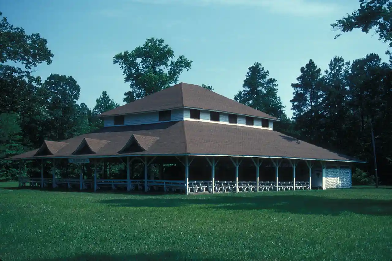 Methodist Tabernacle is a historic Methodist tabernacle located near Mathews, Mathews County, Virginia. It was built in 1922, and is a large, open pavilion with a hipped roof surmounted by a hipped clerestory monitor with wooden shutters. The building has 21 rows of wooden benches on the dirt floor arranged along three aisles. The building is a rare example in Virginia of an early 20th century revival meeting facility. and Accompanying photo Read more on Wikipedia