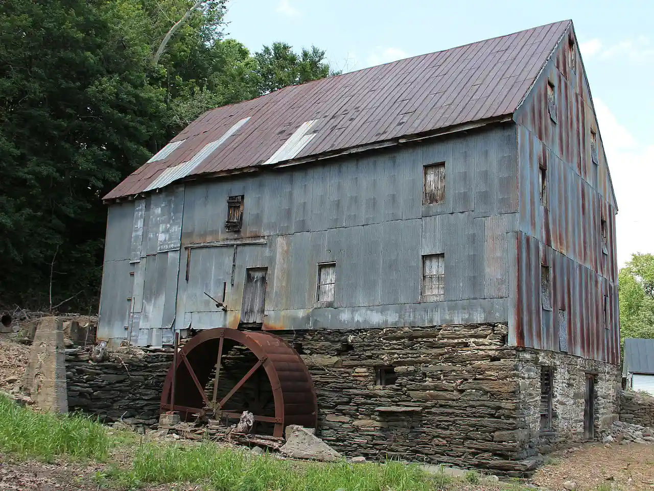 Tyro Mill is a historic grist mill located at Tyro, Nelson County, Virginia. It is a multi-story frame mill built in 1846–47 with an addition made in the late nineteenth century. It has a metal-sheathed gable roof and a stone foundation. There is an overshot metal wheel in a stone wheel well and remnants of the head race. The mill contains original machinery including wood gears and drive shafts, two runs of millstones, and a husk frame in the basement gear pit. Also on the property is a mid-19th century log dwelling—traditionally identified as the miller's house—with twentieth century frame additions and front porch. and Accompanying photograph Read more on Wikipedia
