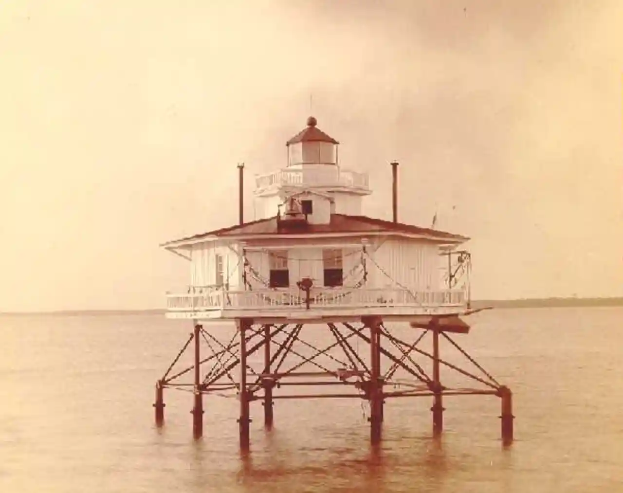 The White Shoal Light was a lighthouse located in the James River near Newport News, Virginia. It outlasted all other lighthouses in the James, finally succumbing to ice in the 1970s. Read more on Wikipedia