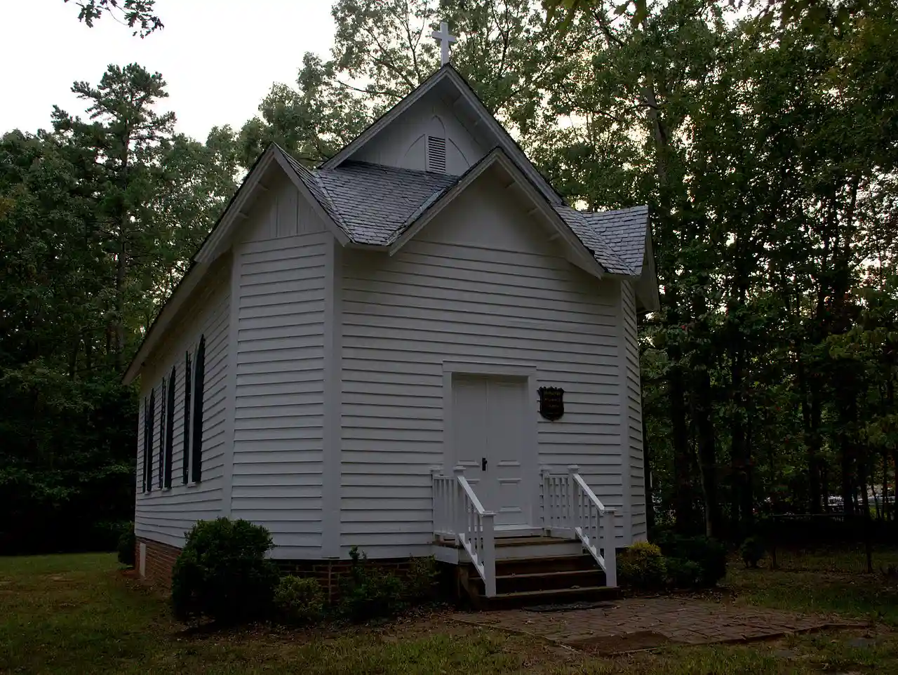 Huguenot Memorial Chapel and Monument is a historic church located at Manakin, Powhatan County, Virginia. Built in 1700 by French Huguenots, Protestant refugees, it was moved to its current location in 1710. It burned down in the Revolutionary War and was later rebuilt with parts of the original building. It is in what is called the Carpenter Gothic style. A new church was built next to this in 1954, and is the one still currently used. and Accompanying photo Read more on Wikipedia