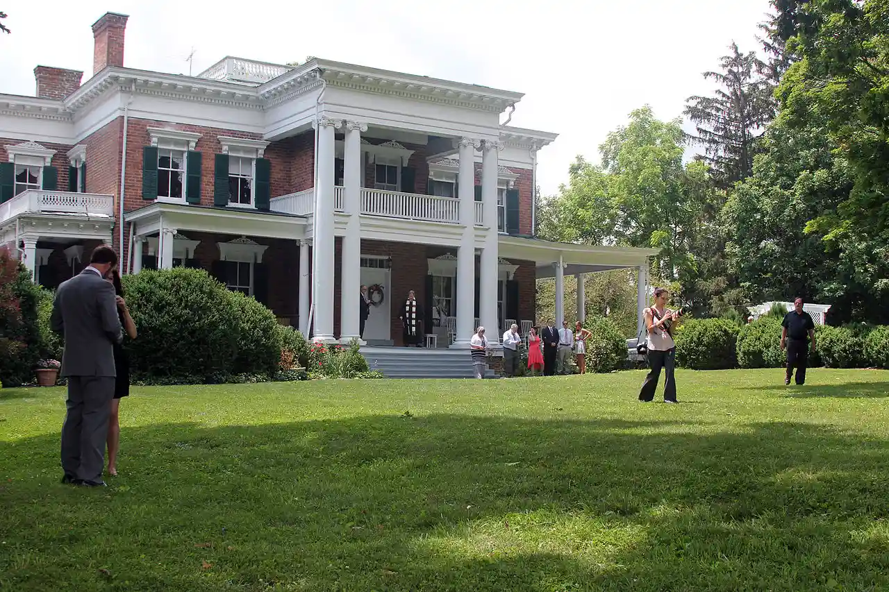 Rockwood is a historic home and cattle / dairy farm located near Dublin, Pulaski County, Virginia. It was built in 1874–1875, and is a large two-story, Greek Revival style brick dwelling. It has a metal-sheathed hipped roof with a deck, interior brick chimneys, two-story semi-octagonal bay windows, ornamental metal lintels, and a Classical Revival wraparound porch added in the 1910s. The center section of the porch rises a full two stories on monumental Ionic order columns. Also on the property are the contributing smokehouse (1870s), garage, ice house site, two chicken houses, pump house, gate pillars, lamb barn, spring house, dairy barn, calf barn, mill house, two pump houses, bull barn, and a corn crib and wagon shed. Many of the contributing outbuildings date to the 1950s. and Accompanying eight photos Read more on Wikipedia