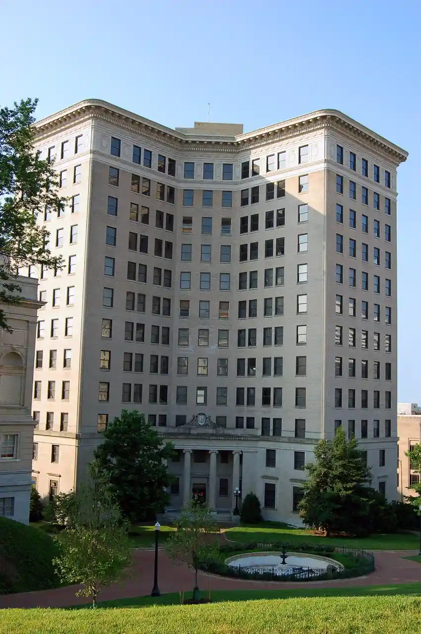 George Washington Building, also known as the Virginia State Office Building, is a historic state office building located in Richmond, Virginia. It was built in 1922–1923, and is a 12-story, steel frame, V-shaped Beaux-Arts style building. The building has a one-story basement, two-story limestone base, nine-story brick shaft, and attic story with a deep cornice that features elaborate terra cotta ornament. Read more on Wikipedia