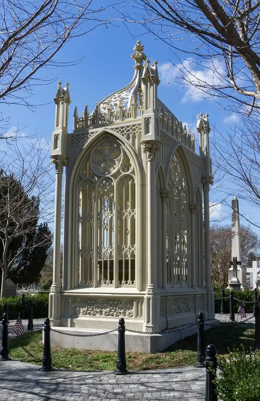 The James Monroe Tomb is the burial place of U.S. President James Monroe in Hollywood Cemetery, Richmond, Virginia, United States. The principal feature of the tomb is an architecturally unusual cast iron cage, designed by Albert Lybrock and installed in 1859 after Monroe's body was moved from Marble Cemetery in New York City. The tomb was declared a National Historic Landmark in 1971 for its unique architecture. and To Richmonders it is colloquially known as The Birdcage. Read more on Wikipedia