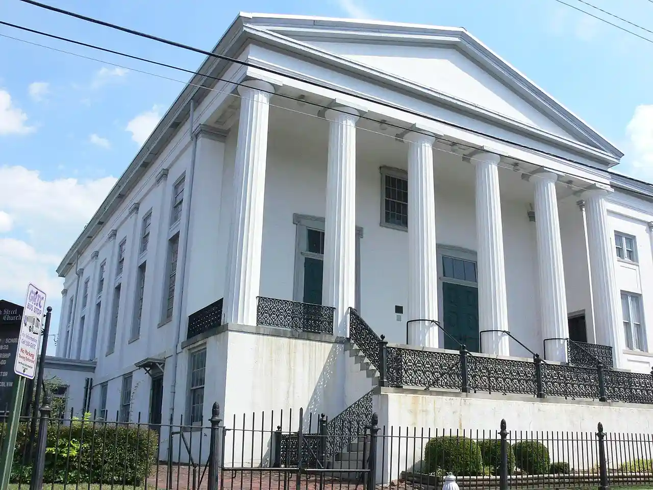 Leigh Street Baptist Church is a historic Southern Baptist church in Church Hill North Historic District which is in Richmond, Virginia. It was designed by architect Samuel Sloan and built between 1854 and 1857. It is a three-story, Greek Revival style stuccoed brick structure. It features a Grecian Doric, pedimented portico with six fluted columns and a full entablature which continues around the side of the church. Additions were made in 1911, 1917, and 1930. and Accompanying photo Read more on Wikipedia