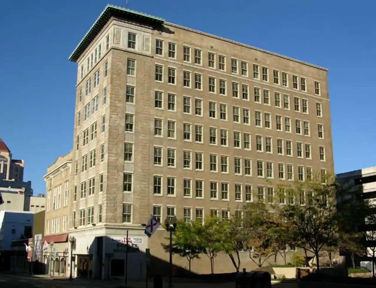 The Boxley Building is a historic commercial building located in Roanoke, Virginia. It was built in 1922, during a wave of post-World War I construction in the city. The building is eight stories, and follows a pattern set by other skyscrapers of the time in consisting of three sections similar to a classical column. The bottom section, or pedestal, is one story fronted with granite; the middle section, or shaft, consists of the next six stories built with beige enameled brick; the top section, or capital, is the eighth story fronted with richly decorated terra cotta panels topped with a finely detailed copper cornice. Read more on Wikipedia