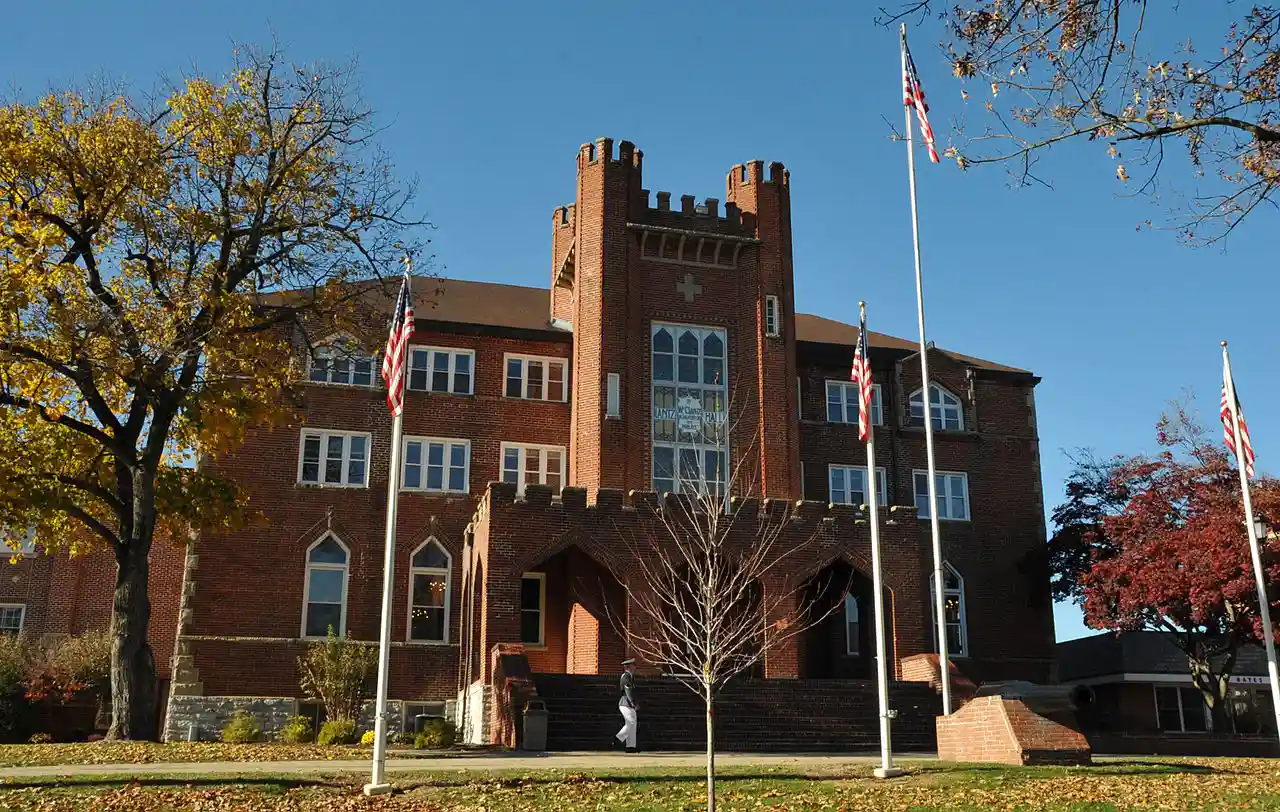 Lantz Hall is a historic building located at Massanutten Military Academy, Woodstock, Shenandoah County, Virginia. It was built in 1907–1909, and is a 3 1/2-story, seven bay by three bay, brick faced frame building in the Late Gothic Revival style. It features a projecting Gothic tower pavilion and three-bay pointed-arched porch. In 1926, a three-story, seven-by-three bay, gable-roofed ell was constructed to the rear. The building houses a dormitory, classrooms, a gymnasium/firing range, and an auditorium. It was the second building built on the Massanutten Military Academy campus. and Accompanying photo Read more on Wikipedia
