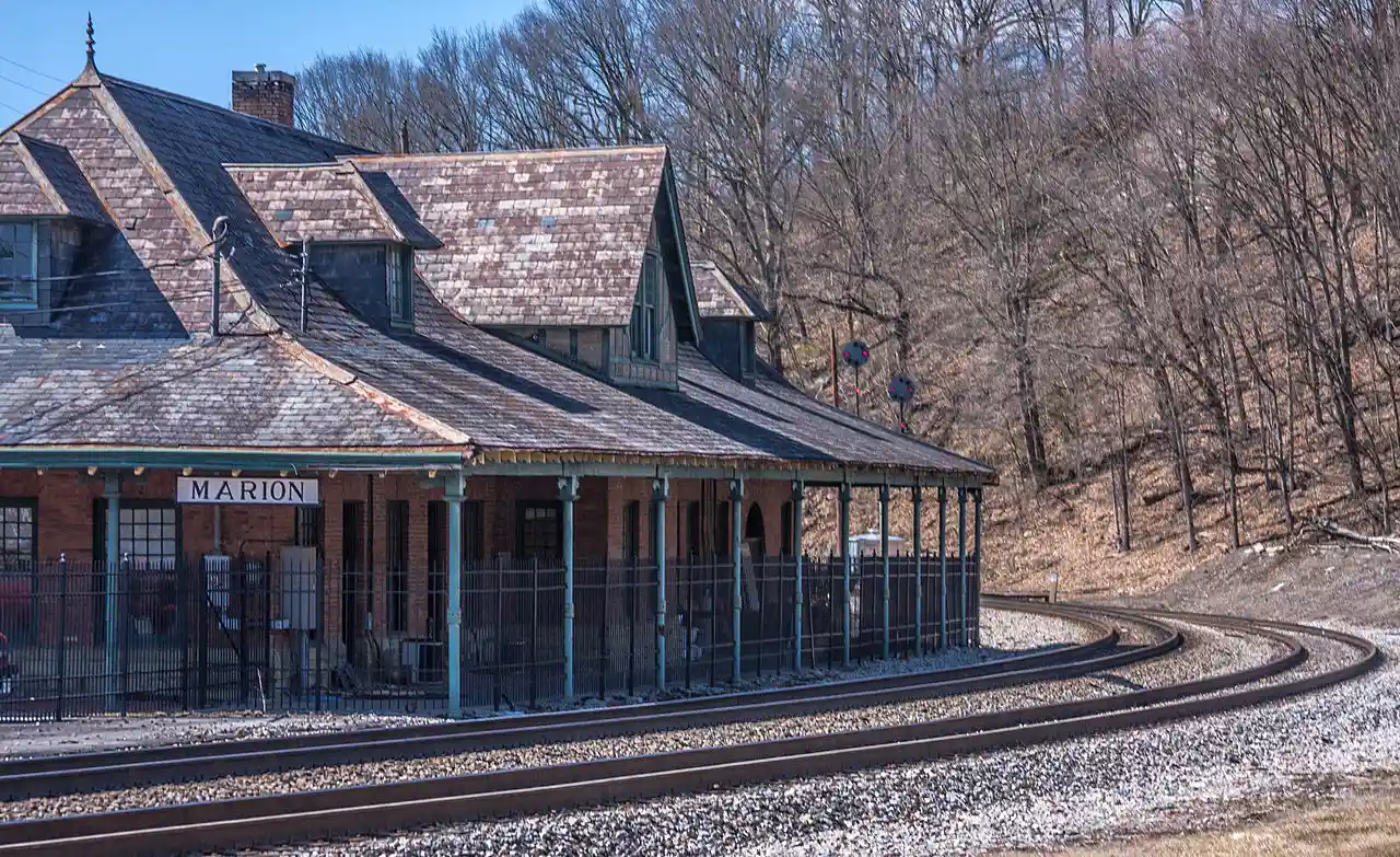 Norfolk & Western Railway Depot is a historic railway depot located at Marion, Smyth County, Virginia. It was built in 1904 by the Norfolk and Western Railway. It is a one-story, stone and brick, Queen Anne style building. It features detailed porches supported by arching brackets on the street side and iron columns on the other three sides and a slate and shingled hipped roof with dormers. The building measures 25 feet by 128 feet, and has an attached former ticket office. The building was converted for office and retail use in 1993–1994. and Accompanying photo Read more on Wikipedia