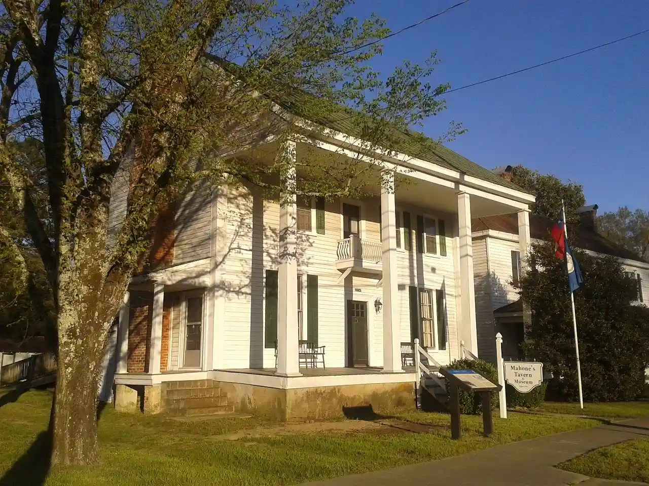 Mahone's Tavern, also known as Kello's Tavern, Vaughn's Tavern and Howard's Hotel, is a historic inn and tavern located in Courtland, Southampton County, Virginia. It was built about 1796, and is a two-story, three-bay, gable-roofed, wood-framed structure with exterior gable end chimneys. A rebuilt hyphen and kitchen structure were added in 1933. In 1831, like nearly every standing building in Courtland, or Jerusalem at the time, it became a refuge and gathering place for local citizens during the slave uprising led by Nat Turner, known as Nat Turner's slave rebellion. The building was also the boyhood home of two persons who later achieved national prominence: Confederate General William Mahone and John J. Kindred, resident from 1859 to 1869, who later became a U.S. Senator from New York. It ceased being used as a tavern or hotel in 1901. and Accompanying four photos Read more on Wikipedia
