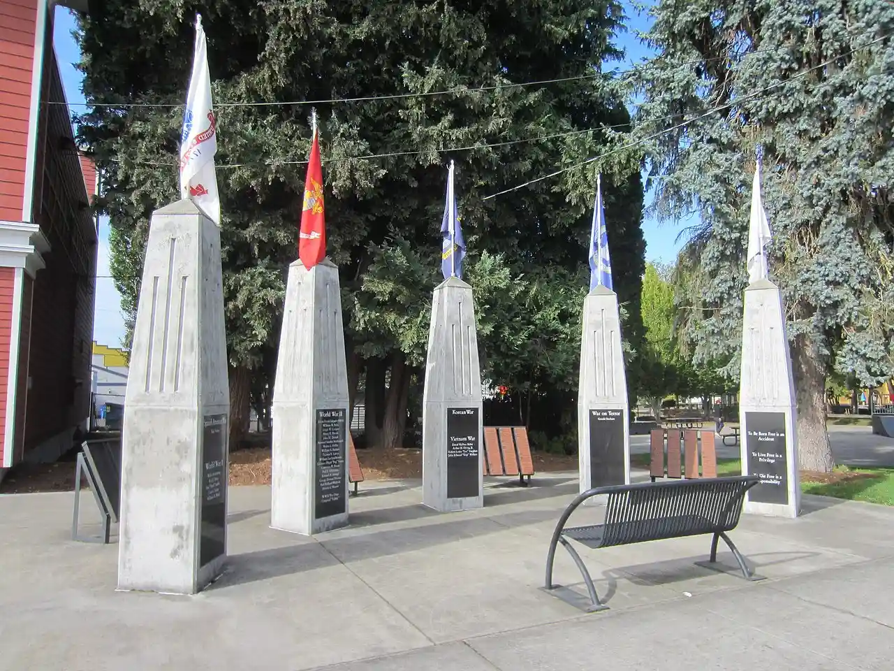 Ridgefield Veterans Memorial is a memorial in Ridgefield, Washington, commemorating locals who died in wars since the Spanish–American War. The memorial features five columns, each topped with a flag representing one of the military service branches, was dedicated in November 2012. Approximately 250 people attended the dedication ceremony. Read more on Wikipedia
