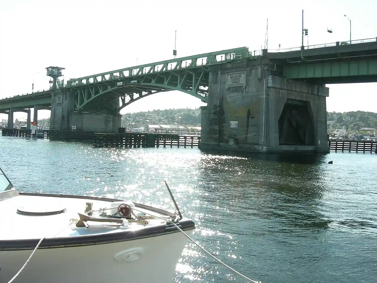 The Ballard Bridge, also known as the 15th Avenue Bridge, is a double-leaf bascule bridge in Seattle, Washington. It carries 15th Avenue NW over Seattle's Salmon Bay between Ballard to the north and Interbay to the south. The Ballard Bridge follows the Fremont Bridge in the east in the succession of bridges spanning the Lake Washington Ship Canal, which connects Lake Washington in the east to Puget Sound in the west. Read more on Wikipedia