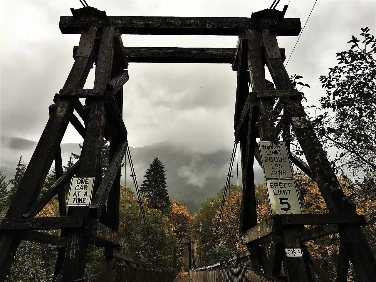 Baring Bridge is a one-lane wood and steel cable suspension bridge crossing the South Fork Skykomish River in Baring, Washington, United States. It carries Index Creek Road, which connects a rural area to U.S. Route 2 in unincorporated King County. Built in 1930, it is one of only two wooden suspension bridges designed for vehicle use in Washington that remain active and was added to the National Register of Historic Places in August 2019. Read more on Wikipedia