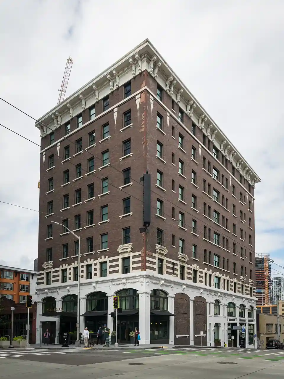 The Calhoun Hotel, later known as the Palladian Apartments and currently the Kimpton Palladian Hotel is a historic hotel building located in downtown Seattle, Washington. Constructed in 1909, The building was built on the recently regraded northeast corner of Second Avenue and Virginia Streets by Scott Calhoun (1874-1952), a well known attorney and Seattle's Corporation Counsel who helped form the Port of Seattle. He commissioned prominent local Architect W. P. White to design an eight-story hotel building, containing 153 rooms on the upper floors and retail at ground level. It was the first building to be completed on the site of the Denny Regrade. It was listed on the National Register of Historic Places on April 23, 2013. Converted to apartments by the 1980s, In 2014 it was restored back into a hotel and is currently run by the Kimpton Hotels & Restaurants brand as the Kimpton Palladian Hotel. Read more on Wikipedia