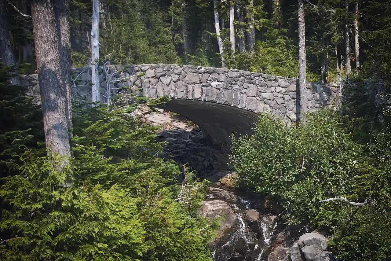 The Narada Falls Bridge is a reinforced concrete arch bridge in Mount Rainier National Park, spanning the Paradise River above Narada Falls. The bridge was built in 1927–1928 by contractor J. D. Tobin of Portland, Oregon, who built the Christine Falls Bridge at the same time. The arch spans . The bridge is wide, with an additional on either side for sidewalks. It was faced with rubble stone masonry and is an example of National Park Service Rustic design. The bridge is not open for public traffic, and leads to the Narada park utility area. Read more on Wikipedia