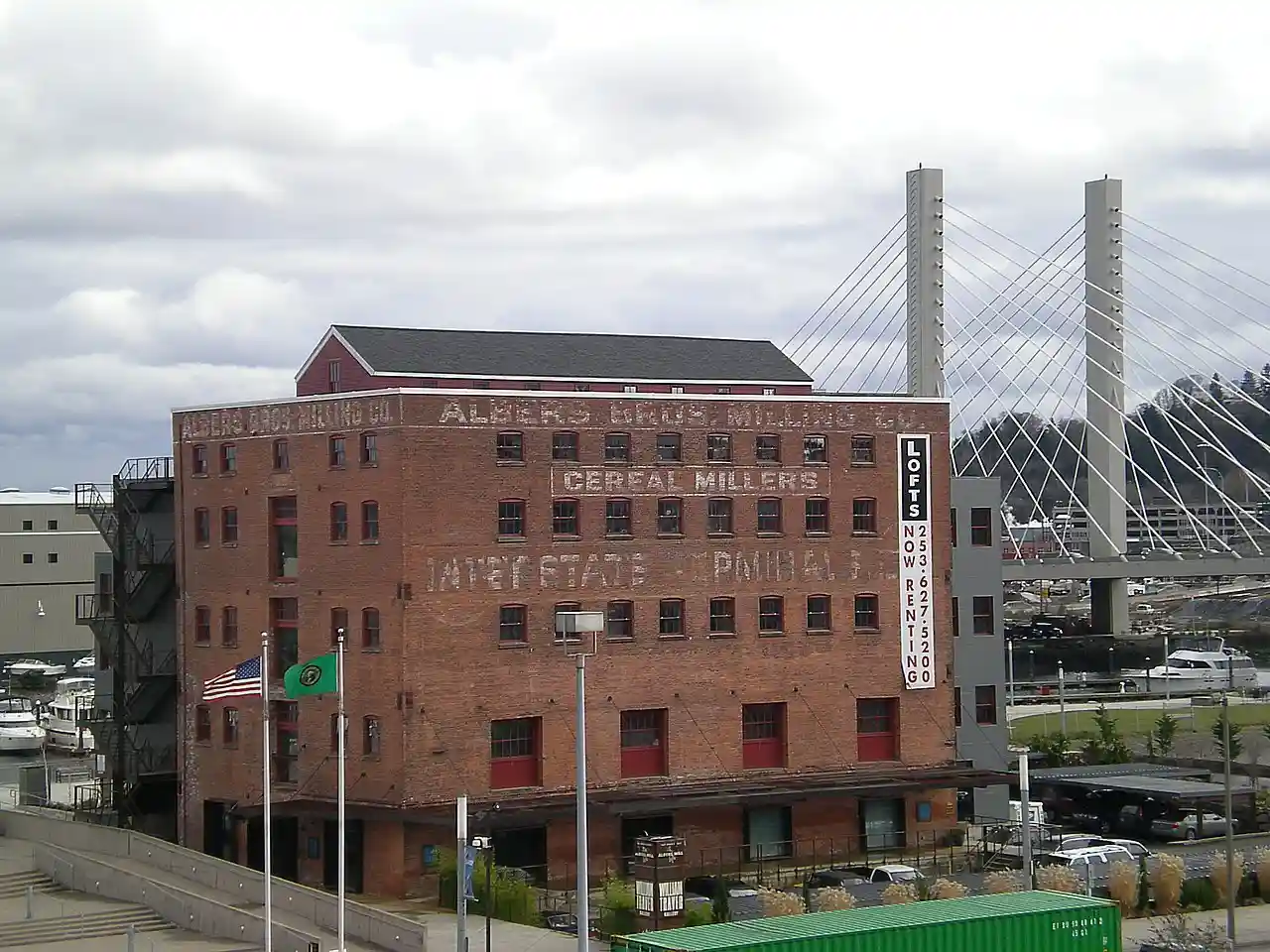 The Albers Brothers Mill is a historic mill and contemporary apartment building located in Tacoma, Washington, United States. The building was listed on the National Register of Historic Places in 1984. The structure is owned by the Foss Waterway Development Authority.. The building, located at 1821 Dock Street, is the only remaining remnant of the working waterfront on the western shore of the Thea Foss Waterway. With the entrance of viable railroad lines into the Puget Sound basin, trade and commerce with Asia and the Pacific Rim ports shifted northward. Albers Brothers Milling Company’s move from Portland, reflects this change. The company started in Portland and became a primary company in the grain industry with its mills in Tacoma, Seattle and Bellingham on Puget Sound. The Albers Milling Company’s headquarters moved to Tacoma to support its Washington operations.Sondra Purcell, Save Albers Mill; Albers Brothers Mill; United States Department of the Interior, National Park Service; National Register of Historic Places; Washington, D.C.; March 20, 2002 Read more on Wikipedia